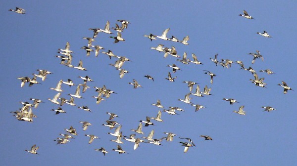 Above: A spring flock of ducks, mostly Northern Pintails, over flooded stubble near Stead, Manitoba; photo by Peter Taylor.