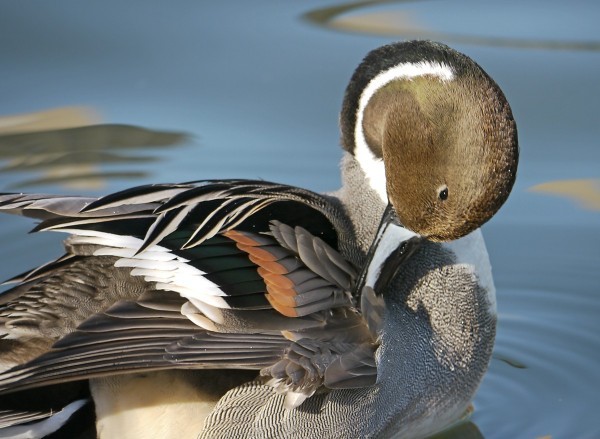 Above: This male Northern Pintail, showing off its field marks while preening, was wintering at a small park near the centre of Tokyo, Japan; photo by Peter Taylor.